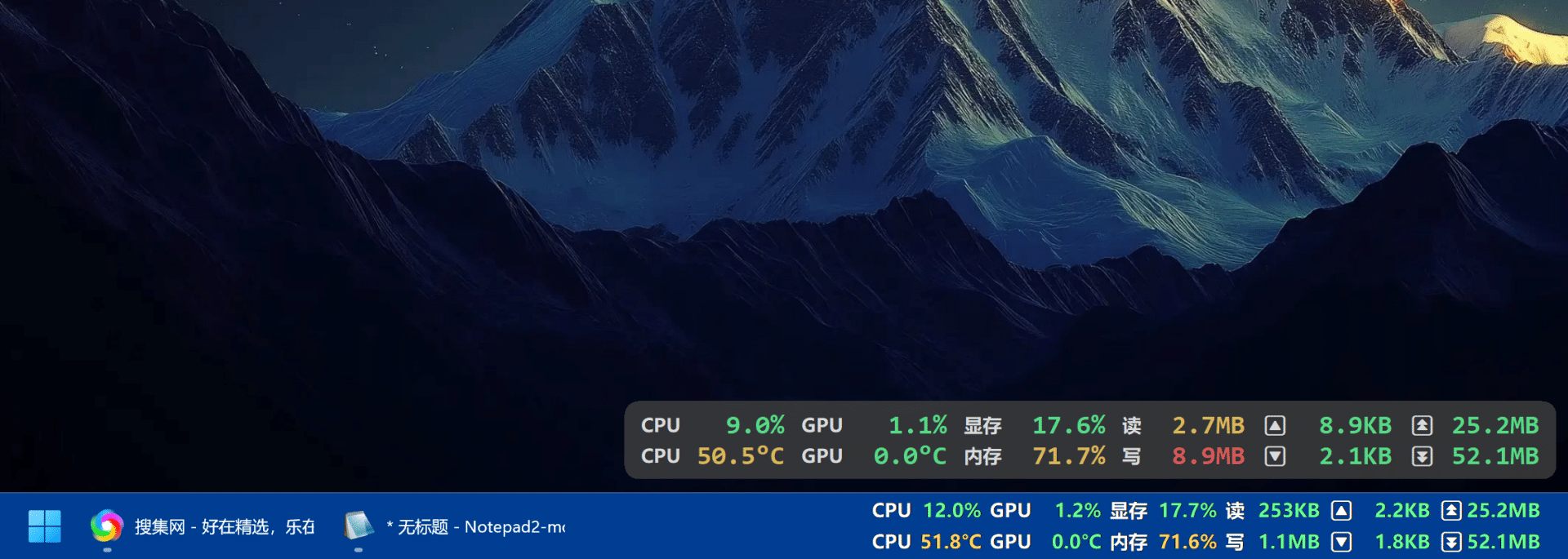 你可以选择让它以“桌面悬浮窗”的形式存在,也可以让它直接嵌入到“任务栏”里。对于 Win11 用户来说,它能完美融合进系统底栏,不占用宝贵的桌面空间,瞄一眼就能看到网速和 CPU 温度。