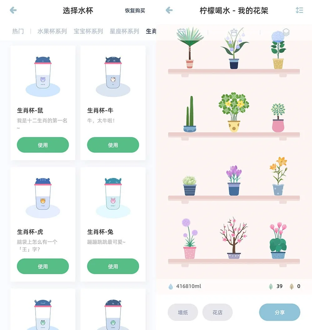 柠檬喝水还提供一些比较有意思的小功能,比如选择不同的水杯,每日完成喝水量后可以打卡,累计打卡后可以种花,轻狂已经把所有花都种完了: