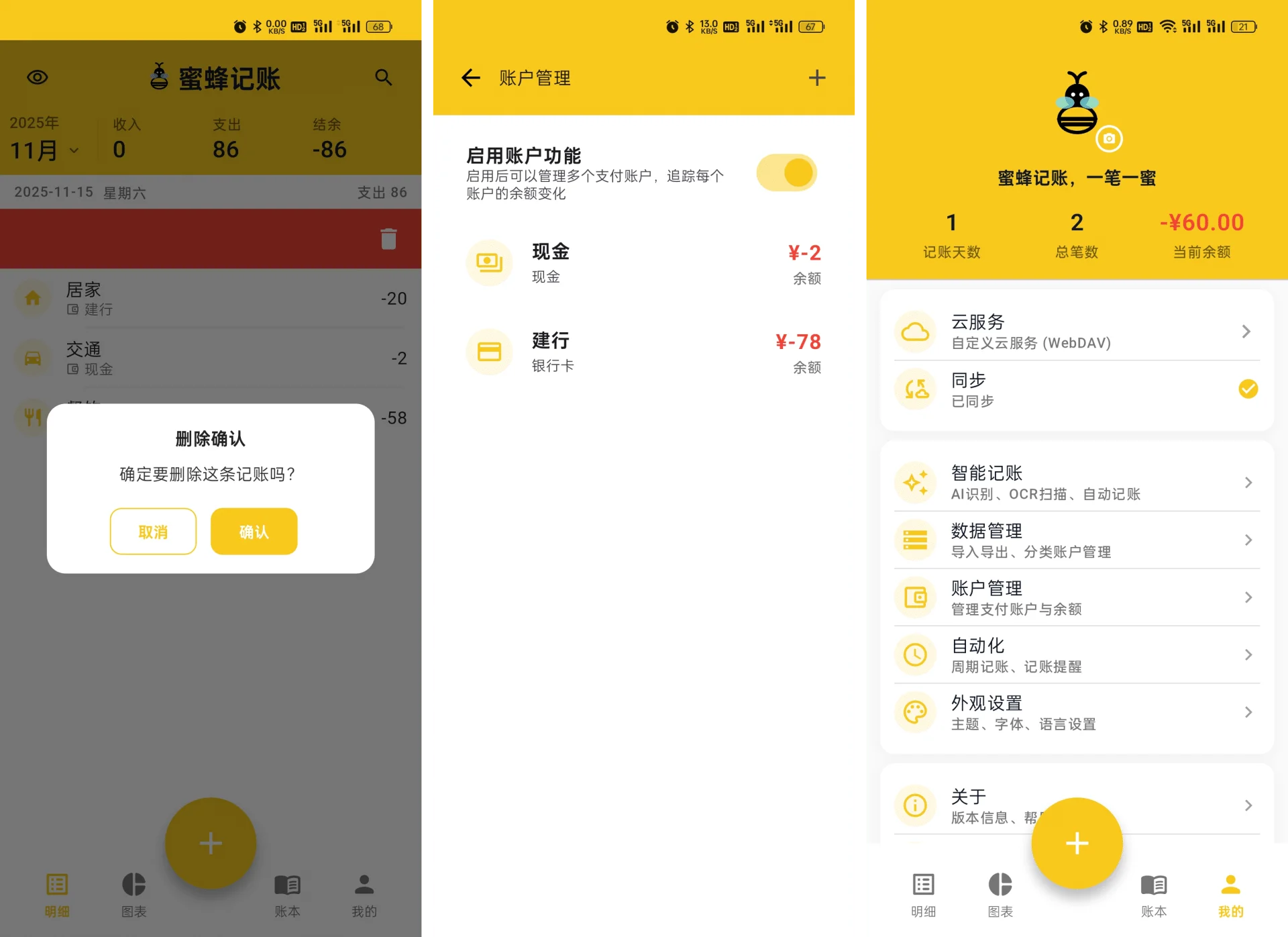 蜜蜂记账,是一款轻量、开源、隐私可控的个人财务管理和支出追踪 App,专为记账用户深度打造,功能强大清爽易用。它追求高效,非常纯净,无社区、理财、广告及运营活动;它功能齐全,支持多账户、多账本;支持拍照记账、AI 识别记账、截图自动记账;支持分类统计、图表分析、数据导入导出;支持 iOS/Android 双平台。