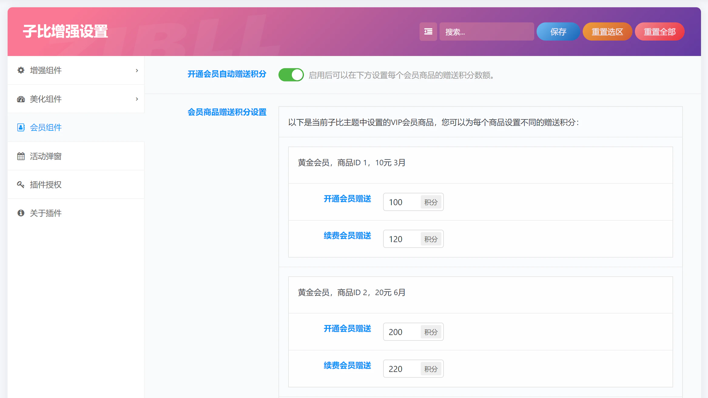 比如你设置了两个级别的会员:黄金会员和钻石会员。黄金会员有两个商品,分别是 15 元时长 1 月,39 元时长 3 月。钻石会员也有两个商品,分别是 100 元时长 12 月,200 元时长 24 月。设置好后,到插件的会员组件菜单下,点开开通会员自动赠送积分,会自动读取你的会员商品,然后你就可以在下方设置上述 4 个商品,开通会员和续费会员分别赠送多少积分了。一般情况下,为了鼓励会员续费,会把续费会员赠送积分设置得比开通会员赠送积分多一些,当然你可以设置相同或更少,这个自行决定。用户在开通或续费会员后,不管使用的是什么支付方式,插件都会按设置好的积分,自动进行赠送,免除手动操作。另外需要说明的是,积分兑换会员,卡密兑换会员,皆不赠送积分。