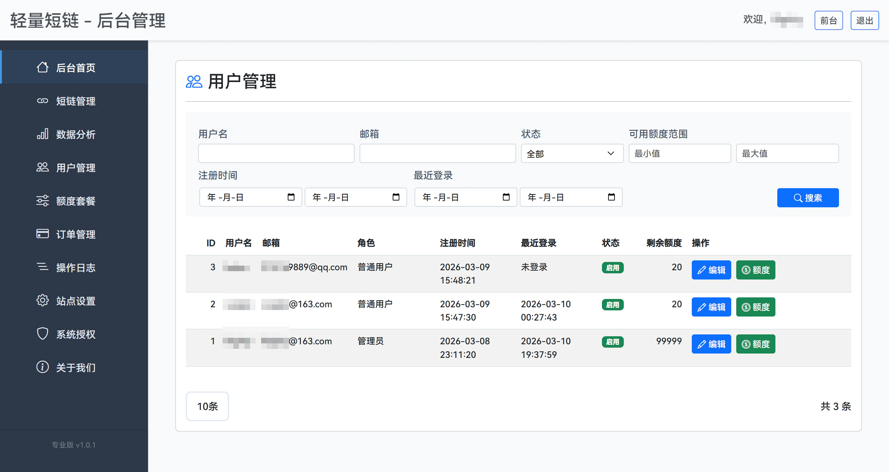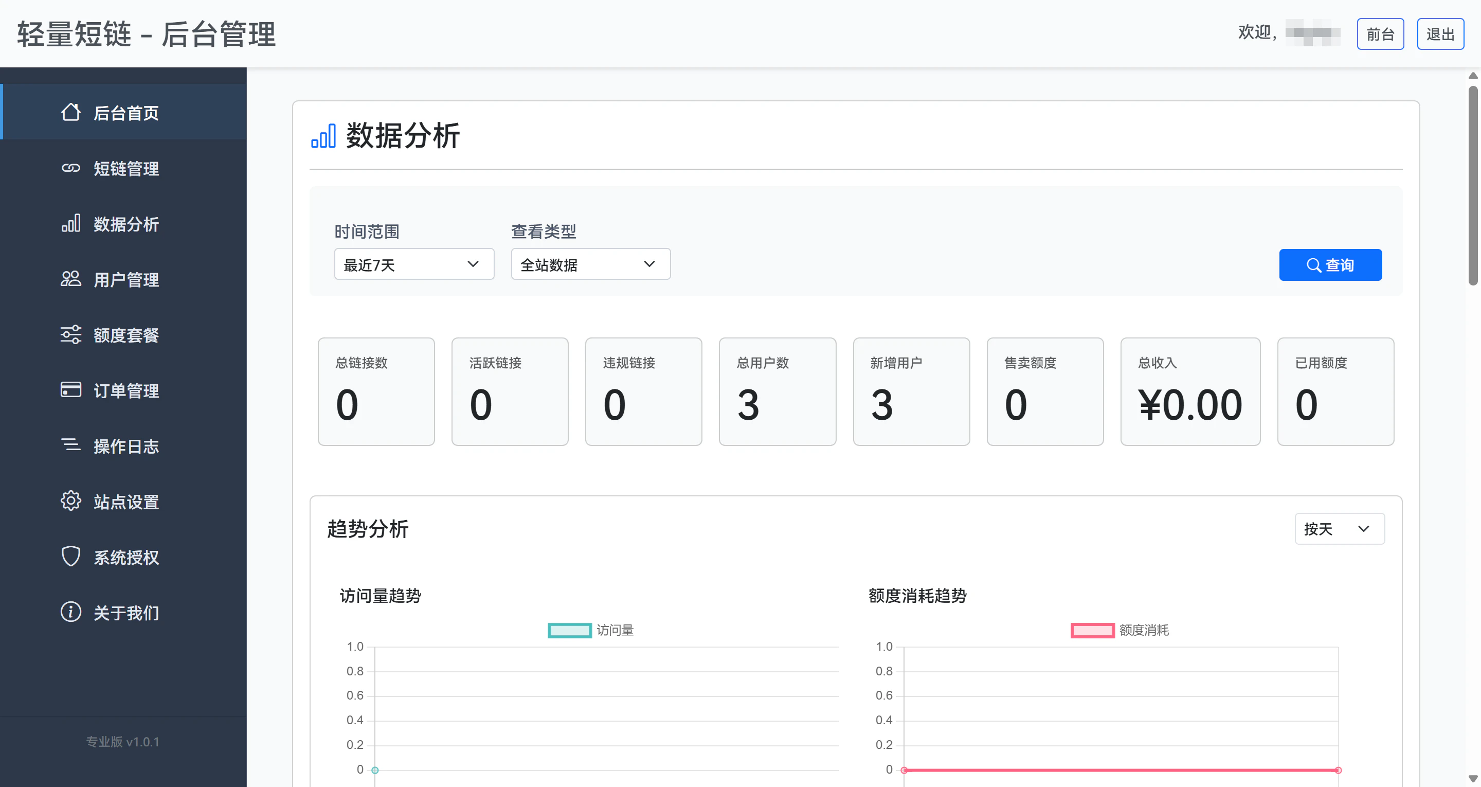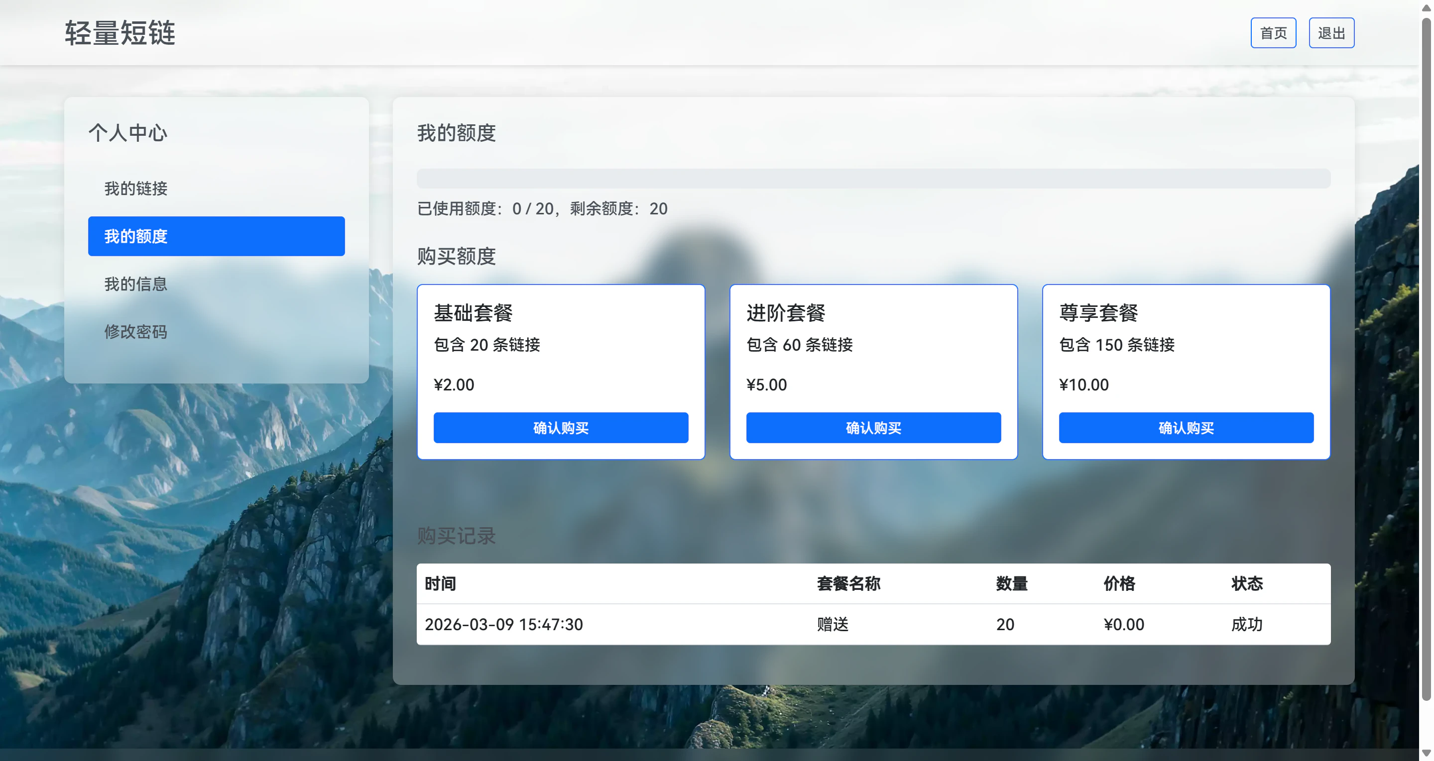 轻量短链是一款核心定位为“支持多用户独立管理+超级管理员违规管控+用户短链额度管控”的极简短链接生成与数据统计工具。前台支持用户快捷生成短链,后台实现严格的多用户账号数据隔离与短链生成额度限制,普通用户登录后拥有默认免费短链额度,仅可管理自身生成的短链接、查看专属数据分析数据,额度用完后可通过购买套餐扩容;超级管理员拥有全站管控权限,可自定义用户注册默认免费短链数量、配置多档位额度购买套餐(单价、数量、金额支持自定义),同时可搭配全局搜索功能快速定位并处理违规链接,额外支持查看用户额度使用与充值记录,全程保留精细化数据统计、一键复制、响应式布局等核心特性,整体界面简洁易用,兼顾个人使用、小型团队多成员协作及平台违规内容治理、轻量化变现需求。